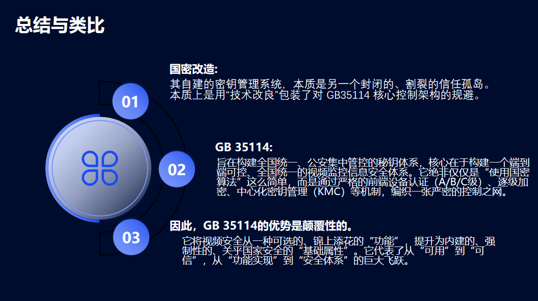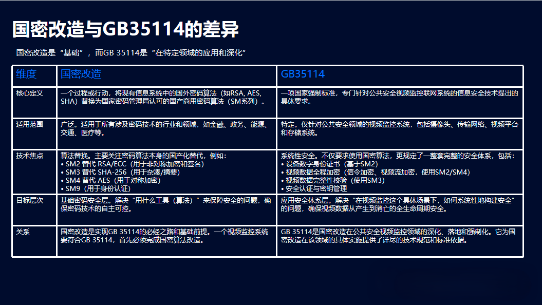 这种 “伪合规” 建设模式,虽未真正满足 GB35114 A 级标准,却恰好适配了国密改造与密评要求的落地需求,让行业陷入两难困境。国密厂家依托私有平台快速完成国密改造,能轻松满足密评的技术指标要求,项目方也能借此规避验收风险,但这种 “避重就轻” 的建设方式,却彻底背离了 GB35114 守护公共安全的初衷。一边是国标强制规范的刚性要求,一边是国密改造、密评落地的现实需求,如何在适配后者的同时回归国标建设本质,破解标准落地与项目建设 “两张皮” 的难题,成为当前公安视频监控系统建设亟待解决的核心问题。